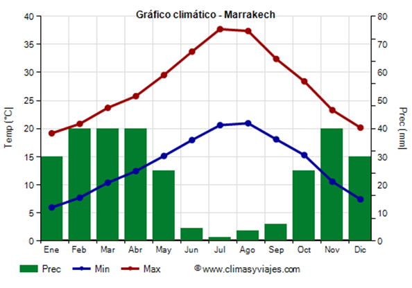 Marrakech se puede disfrutar todo el año gracias a su clima. No obstante  los meses de verano como podrás imaginar son muy calurosos. Y en invierno tendrás que abrigarte. Tanto otoño como primavera  son muy buenas opciones, con temperaturas más moderadas, en general cálidas por el día y refrescando por la noche.
