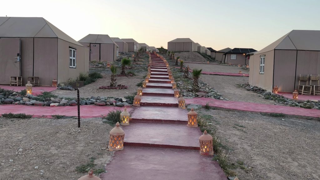 Tras un divertido y movido viaje a través de las pedregosas dunas de este desierto, se llega al campamento de las jaimas donde tras pasar por recepción te acomodan en una de ellas. Las jaimas están perfectamente acondicionadas y cuentan con baño privado, aire acondicionado y suele haberlas de dos categorías, estándar y superior. En ellas pueden pernoctar hasta 4 personas por lo que la excursión también es apta para ir con niños.