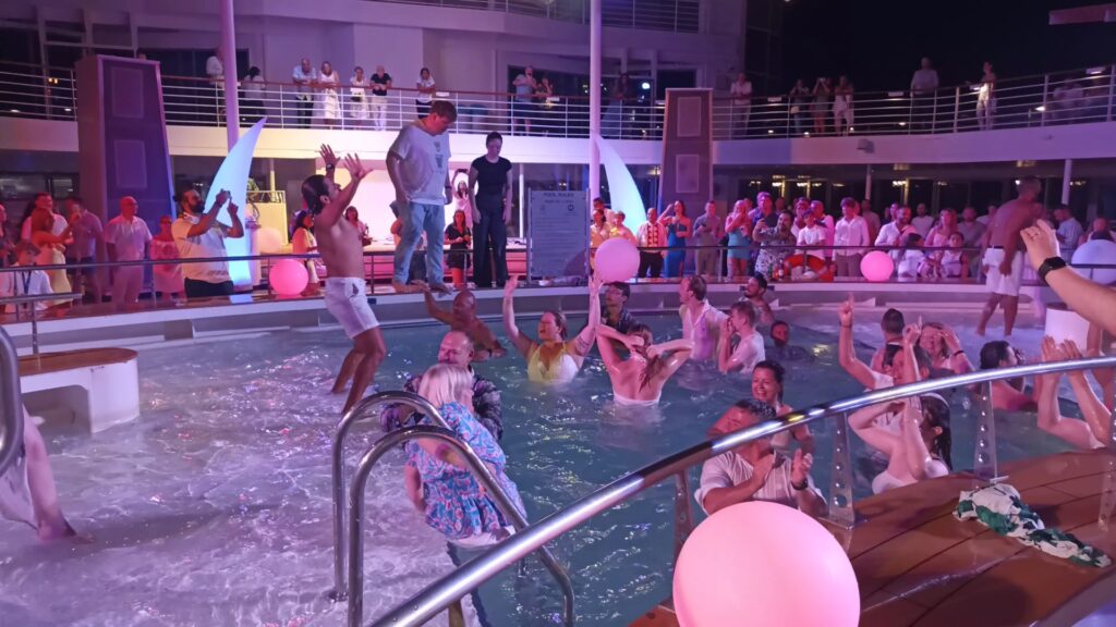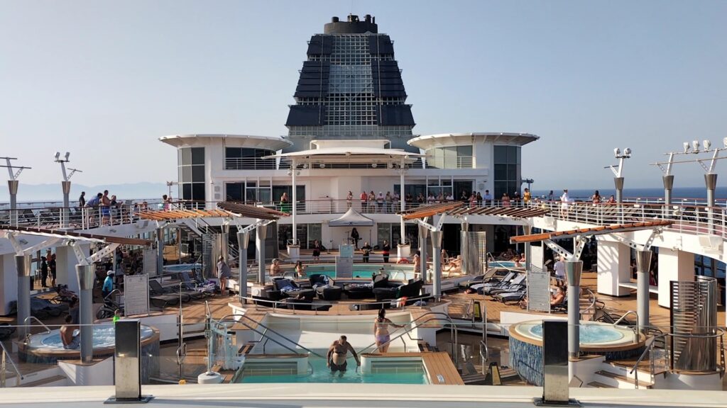 Los barcos más modernos incluyen piscinas cada vez mejores y más completas, incluso auténticos parques acuáticos y zonas diferenciadas para niños y “sólo adultos”. Pero hay que entender que en cualquier caso se trata de un barco y no de un resort, por lo tanto el tamaño de piscinas y jacuzzis no suelen ser tan amplios como en aquellos y se pueden ver saturadas, sobre todos los días de navegación, cuando todo el pasaje está en el interior del barco.